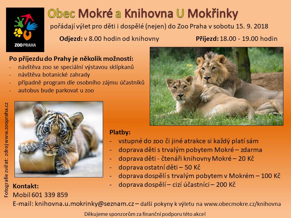 Obec Mokré a Knihovna U Mokřinky pořádá nejen pro rodiče a děti výlet do Zoo Praha dne 15.9.2018. Pokyny a kontakty na plakátu zde: Výlet do ZOO 15.9.2018[1].jpg