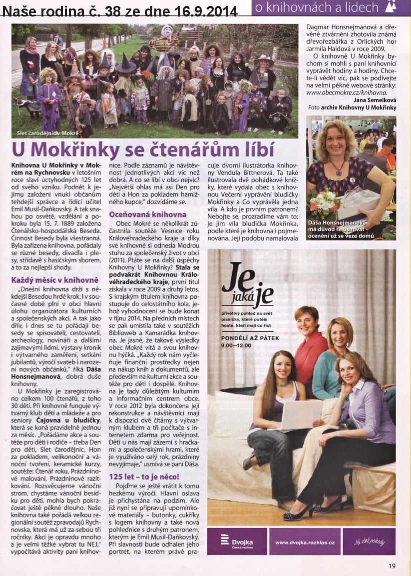 Český týdeník, který byl založen roku 1968 otiskl v sekci o knihovnách a lidech článek o výročí naší knihovny U Mokřinky. Je to velký úspěch! Týdeník Naše rodina vychází jako celostátní!