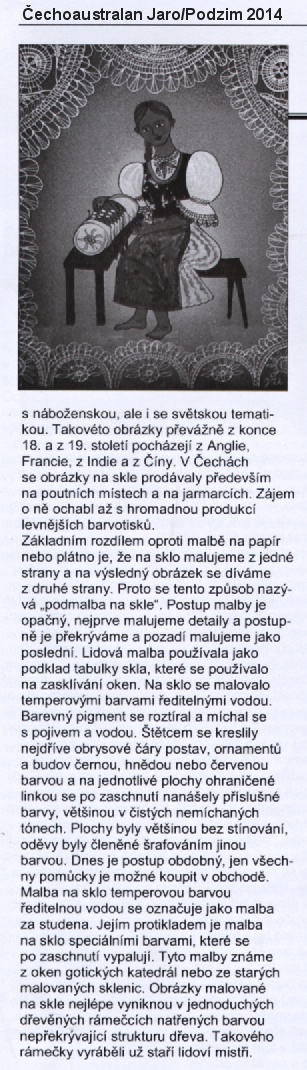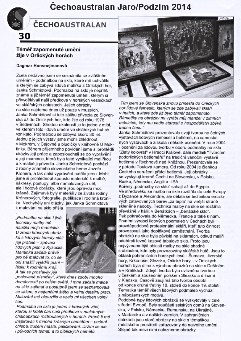 V krajanském listu Čechoaustralan právě vyšel článek o lidové malířce podmalby na sklo Jance Schmidtové, která své obrazy vystavovala a naší knihovně.