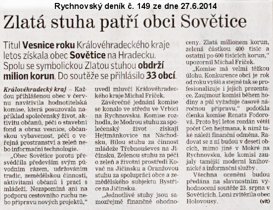 Rychnovský deník č. 149 přináší dne 27.6.2014 zprávu o výsledcích soutěže Vesnice roku 2014