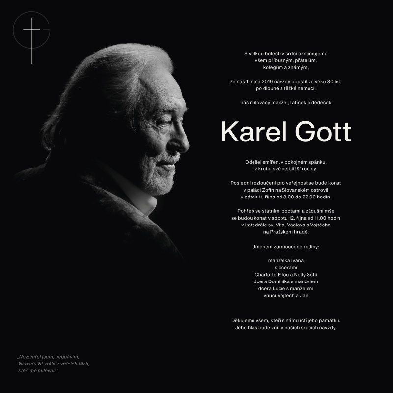 Dne 1.10.2019 zemřel zpěvák, pan Karel Gott. Na den 12.10.2019 byl v České republice vyhlášen státní smutek.